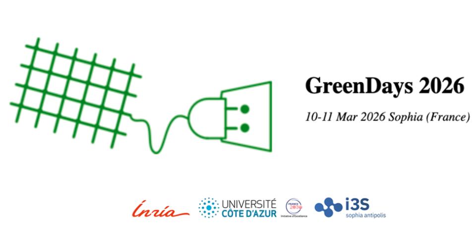 Frédéric Giroire, Joanna Moulierac et Guillaume Urvoy-Keller, organisent les GreenDays inter-GdR 2026 au Centre Inria d'université Côte d'Azur à Sophia Antipolis, les mardi 10 et mercredi 11 mars 2026.